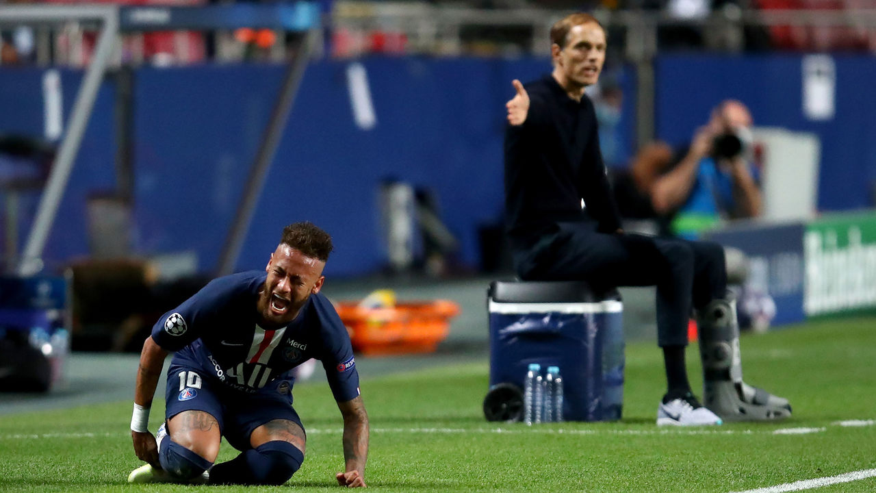 PSG manager Thomas Tuchel gestures to the referee as Neymar suffers from one of his game-high six fouls.